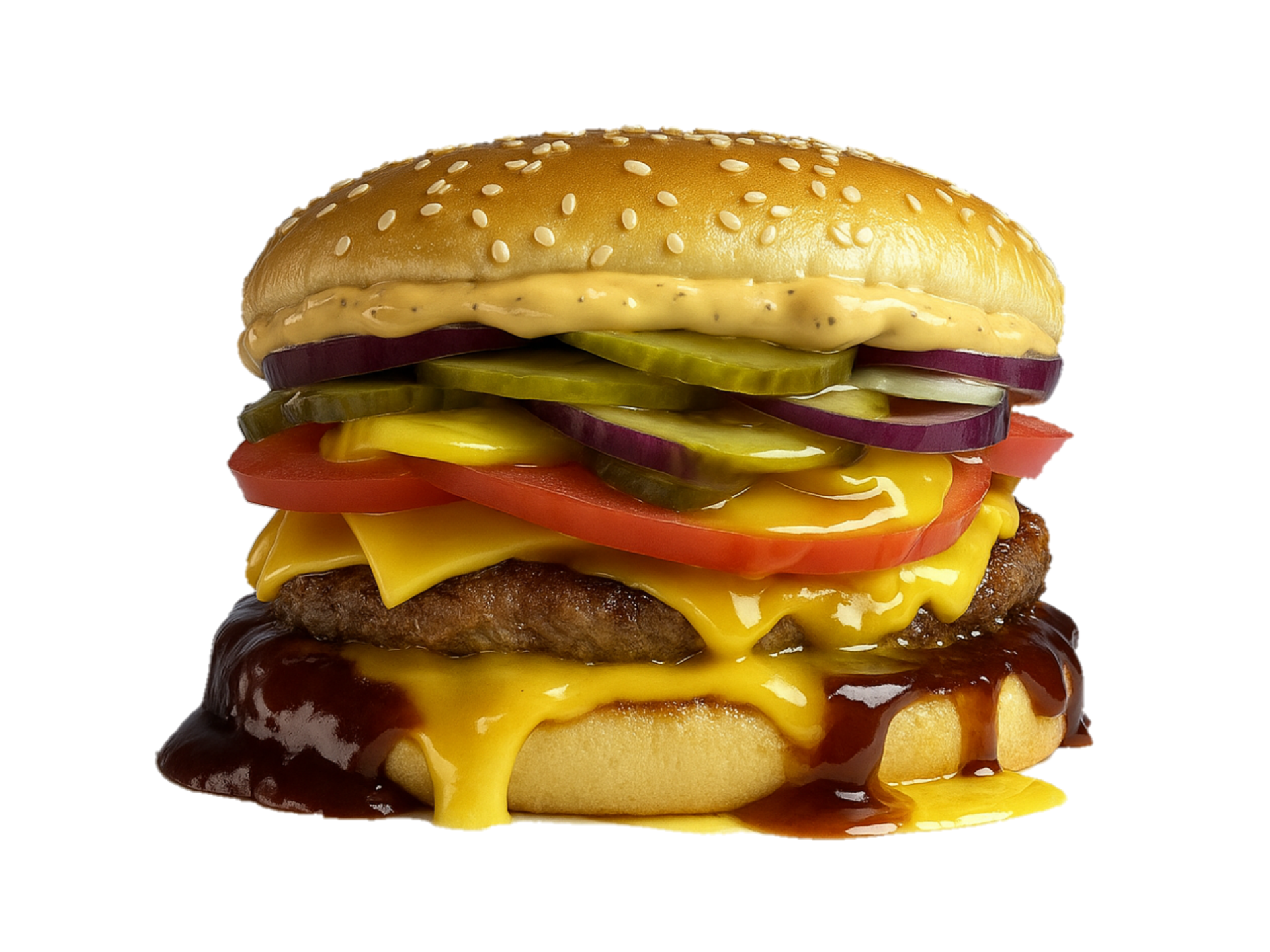 Булочка белая с кунжутом, соус BBQ, сыр моцарелла, котлета из курицы, сыр чеддер, томат, огурец маринованный, лук красный, яйцо, соус гриль.