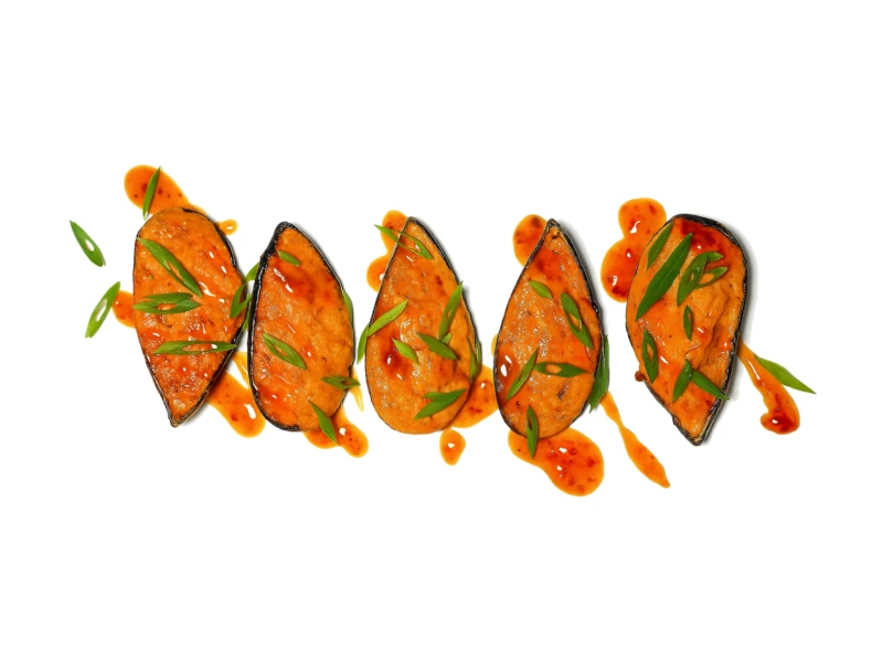 мидии 5 шт, соус устричный, шапочка спайси, соус тайский чили, лук зеленый
