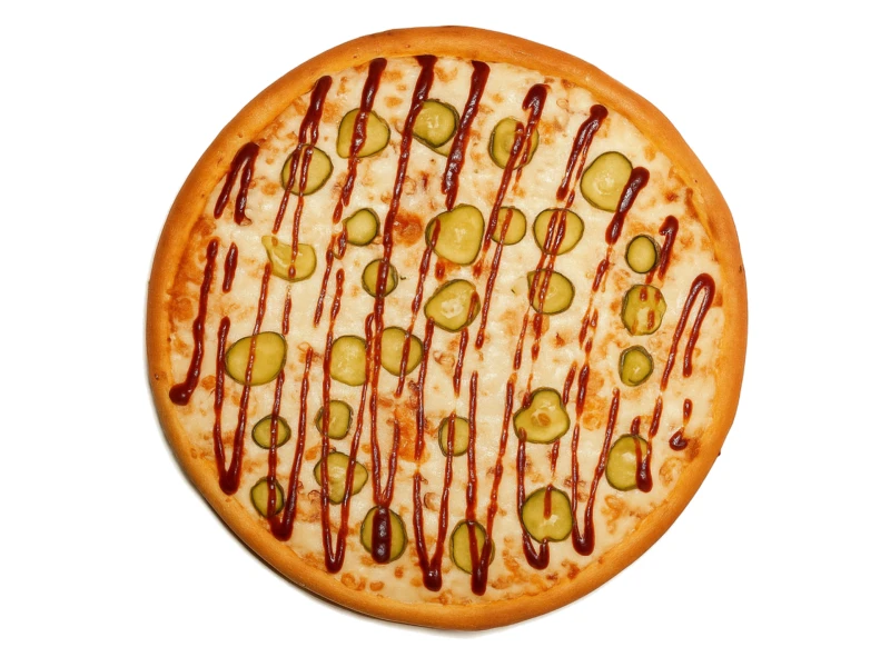тесто, куриное филе, огурец соленый, соус ким чи, моцарелла, соус томатный