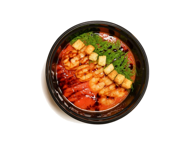 креветка, перец болгарский, огурец, помидор, лук репчатый, чеснок, укроп, соус бальзамический, сухарики чесночные