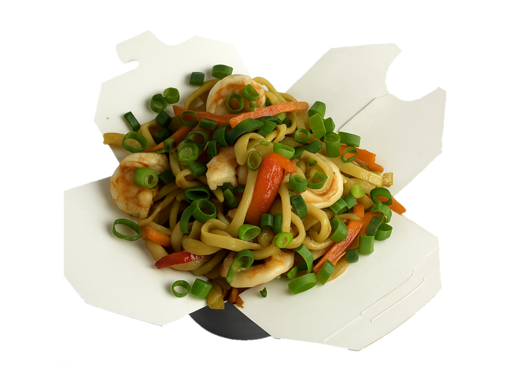пшеничная лапша, креветка, соус тайский чили, овощи, лук зеленый