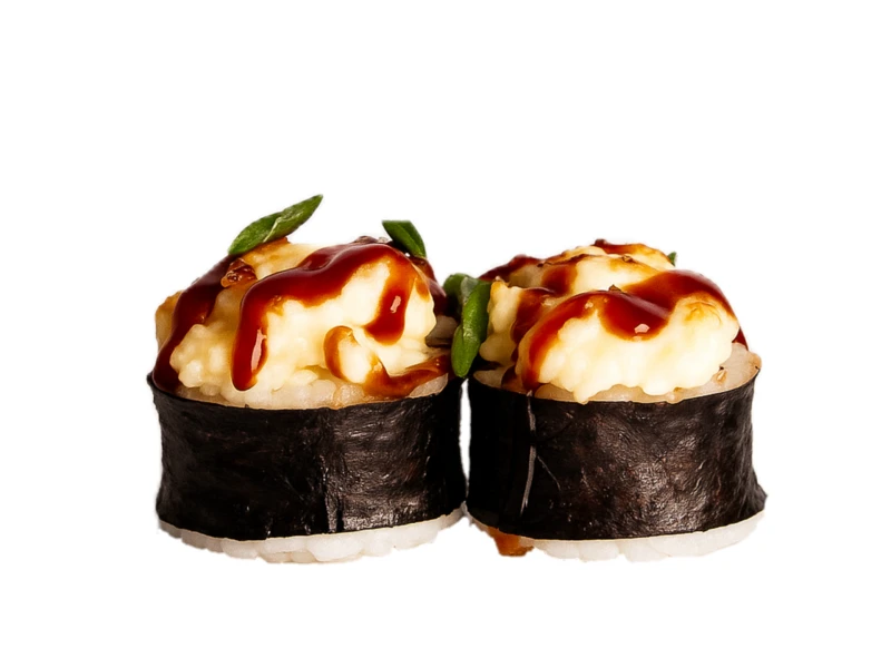 рис, нори, креветка, сыр сливочный, огурец, сырная шапочка, соус унаги, лук зеленый